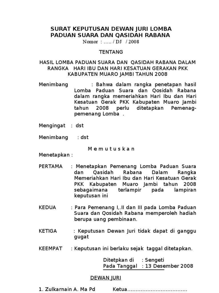 Contoh Surat Keputusan Pemenang Lomba Surat Surat Lengkap from imgv2-2-f.scribdassets.com Dalam pembuatan surat pengajuan keputusan pertama harus menggunakan bahasa formal, jelas isinya, sopan dan dapat di pertanggungjawabkan. Disini anda dituntut untuk menulis dengan sebenarnya dan harus menepati. Untuk menjaga kualitas sebuah perlombaan untuk menyampaikan juara lomba, bisanya dituangkan dalam bentuk surat keputusan penetapan juara yang ditandatangani oleh semua juri perlombaan. Penetapan pemenang lomba kelompok ke lompok masyarakat masyarakat pengawas pengawas. Maybe you would like to learn more about one of these? Penjelasan lengkap seputar contoh surat keputusan yang baik dan benar. Sk penetapan contoh surat keputusan organisasi. Image result for contoh surat keputusan pengangkatan kepala cabang.
